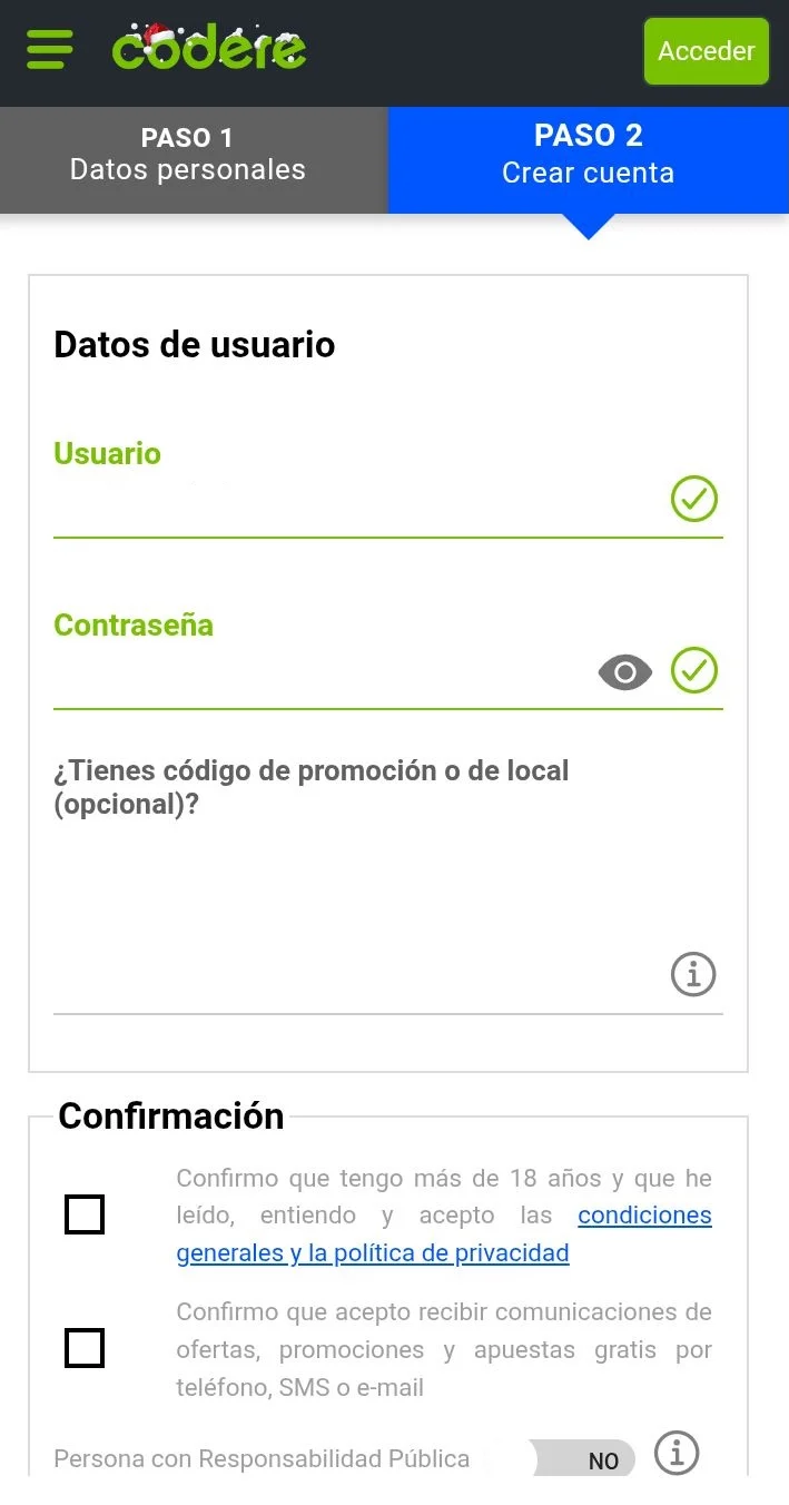 Verificación de cuenta en Codere