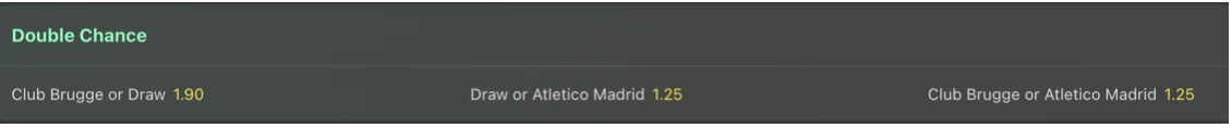 Como ejemplo de que significa doble oportunidad 12 la eliminatoria de Champions League del Atlético de Madrid ante el Brujas puede ser una buena muestra. Se trata de un partido para el que el Atlético de Madrid es favorito, ya que su victoria o la del Brujas se paga a una cuota más baja que la opción del triunfo local y el empate.